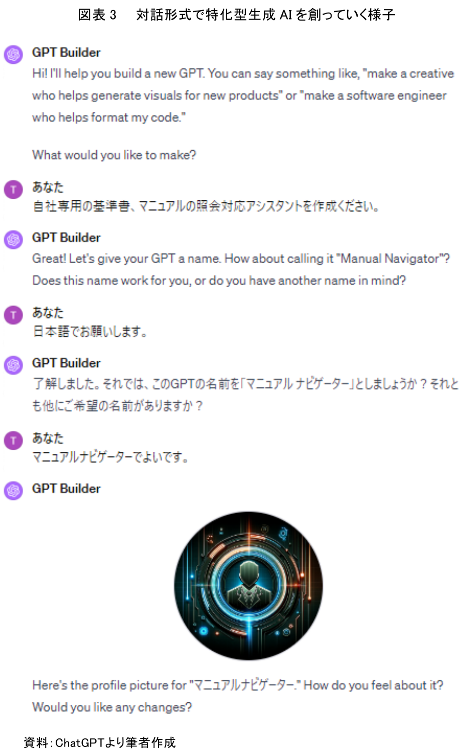 次に、特化型生成AIを作ることができる機能について確認してみよう。特化型生成AIの作成機能を用いると、自社の業務に特化したAIを作成できる。実際にこの生成AIを作る機能のトップ画面を開いてみたところ、生成AIのナビゲーターは、『こんにちは!新しい GPT の構築をお手伝いします。「新製品のビジュアル生成を支援するクリエイティブを担当してください」、「コードのフォーマットを支援してくれるソフトウェア エンジニアを担当してください」などと言えます。何を作りたいですか?』と質問してきた。そこで必要とするAIの役割について対話したり、情報を読みこませていくことによって自社に必要なAIを作成できる。たとえば、自社の内部資料となる基準書やマニュアル照会対応AIを作りたい場合、プログラムスキルがない人でも対話形式でAIに伝えれば、自社専用の基準書・マニュアル照会AIを作ることができる(図表3)。