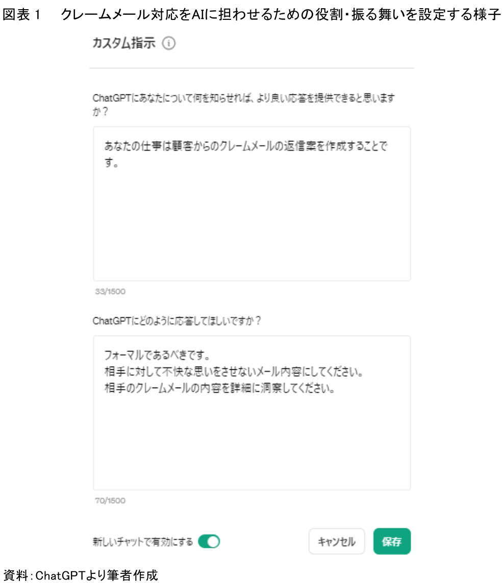 AIによるクレームメール対応は、事前準備工程と返信メール生成工程の2つの段階に分けられる。事前準備工程では、AIの活用における個別の役割や振る舞いを設定し、AI上でこれらの設定を有効化することが重要である。AIに対する役割としては「顧客からのクレームメールの返信案を作成すること」と定め、クレームメールへの応答においては「応答はフォーマルであること」「相手に不快な思いをさせないこと」「クレーム内容を詳細に洞察すること」を事前準備作業として設定し、AI上で有効化する(図表1)。