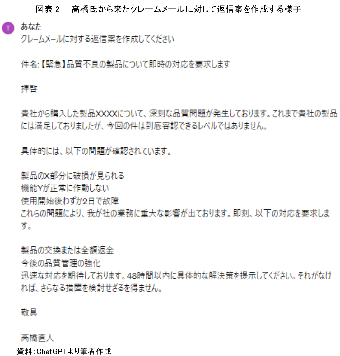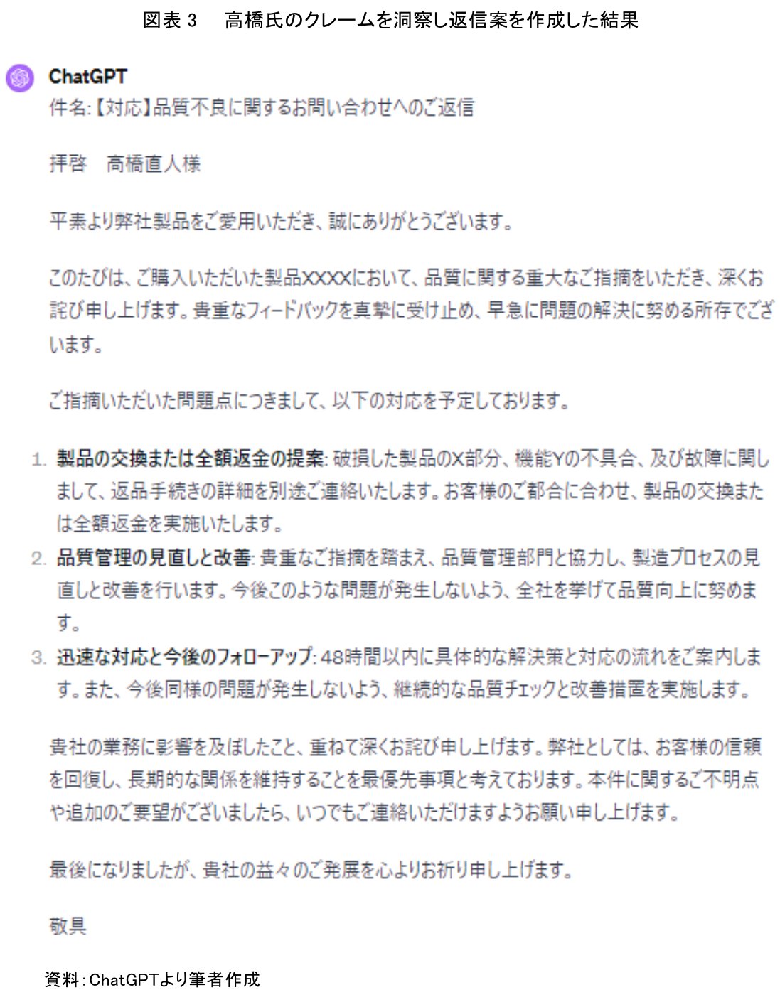 その結果、AIは事前の設定に従い、高橋氏からのクレーム内容に記載されている問題点(破損している、作動しない、2日で故障)や要望事項(全額返金、品質管理の強化、48時間以内の解決策の提示)を把握したうえで、フォーマルかつ高橋氏に不快感を与えない返信案を瞬時に作成した(図表3)。このプロセスでは、AIが高橋氏のメールの内容を詳細に分析し、その内容に沿った適切な返信を生成した。このように、AIを活用することで、クレームメールへの迅速かつ適切な対応が実現されることがわかる。