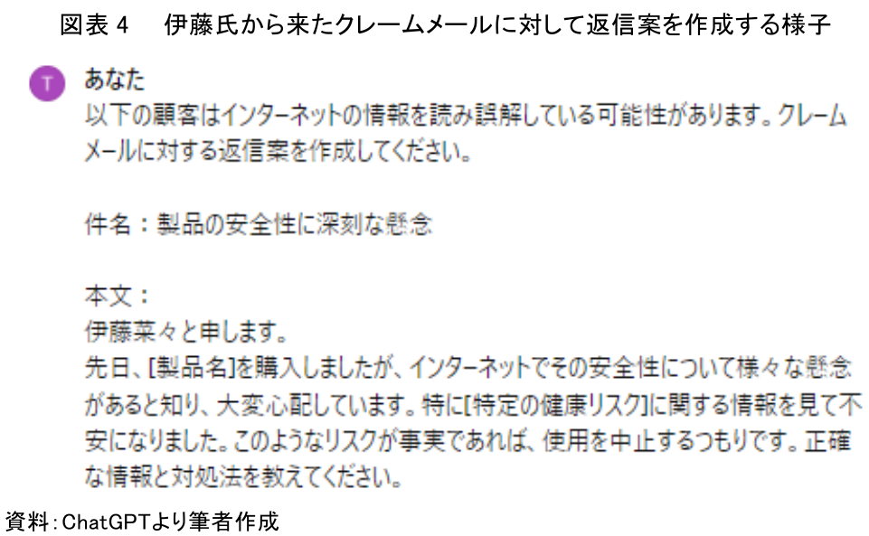 次に、別の顧客である2人目の伊藤氏からの企業に落ち度がないクレームメールに対して、「以下の顧客はインターネットの情報を読み誤解している可能性があります。クレームメールに対する返信案を作成してください」という指示文をAIに出してみた(図表4)。
