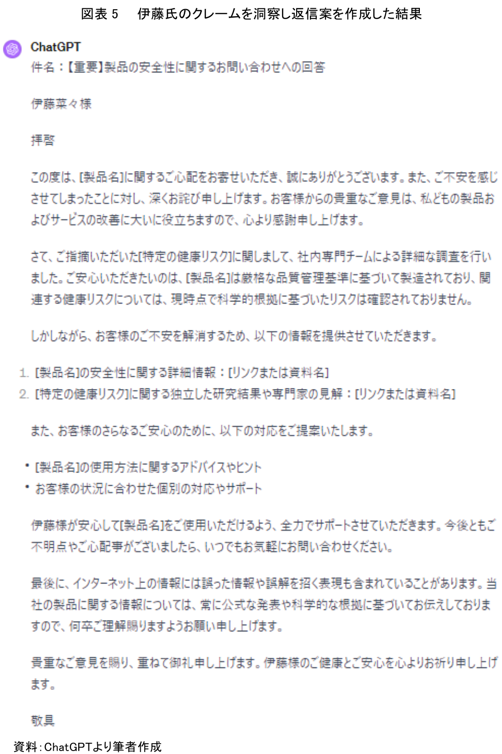 その結果、AIは事前の設定に従い、伊藤氏からのクレーム内容に記載されている問題点(安全性に関する懸念、健康リスク)や要望事項(正確な情報開示、対処法)を把握した上で、フォーマルかつ伊藤氏に不快感を与えない返信案を瞬時に作成した(図表5)。この過程で、AIは顧客のメールの内容を詳細に分析し、その内容に沿った適切な返信を生成している。