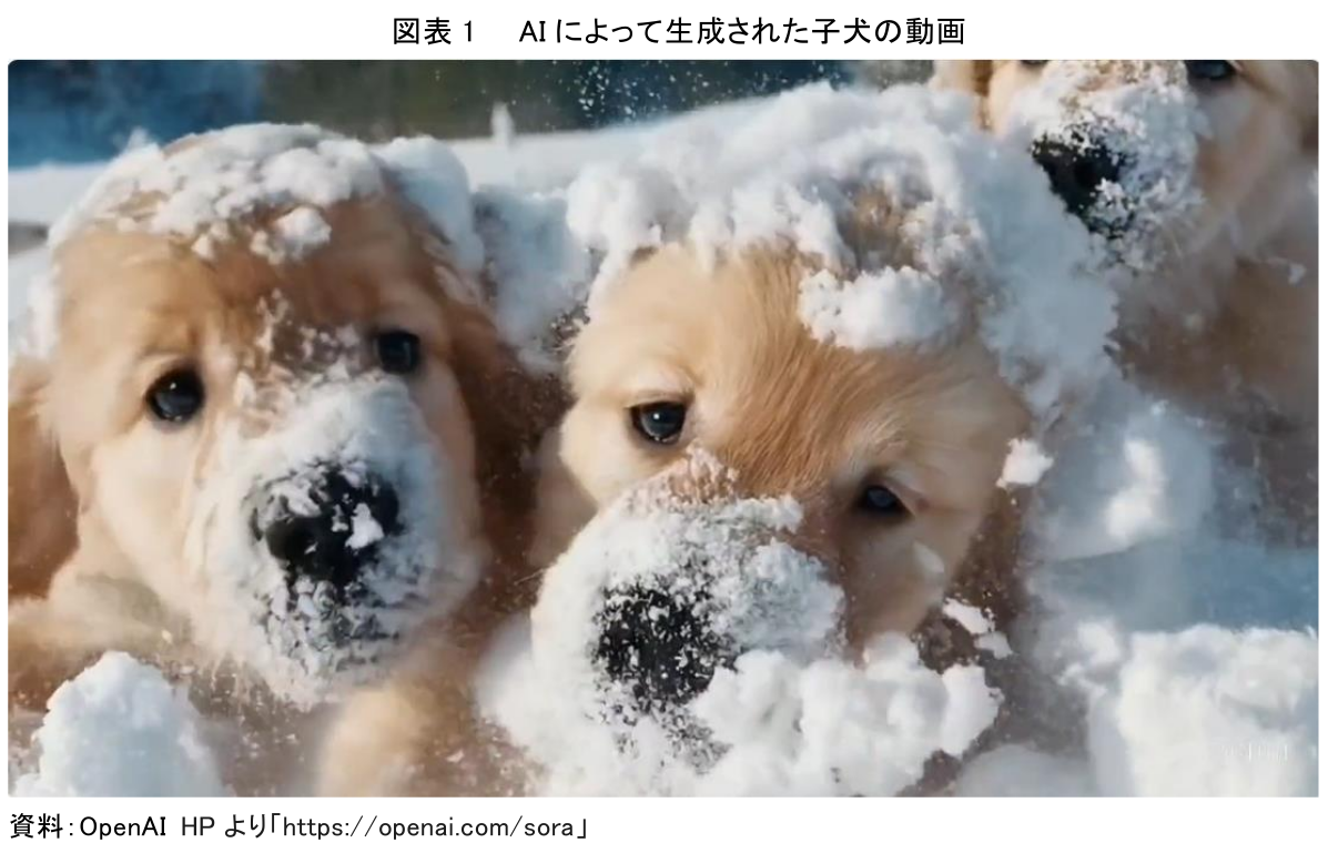 まず、欠点がまったく見当たらない動画の例として、犬が雪の中で遊んでいる動画を挙げる。AIに「雪の中で遊ぶゴールデンレトリバーの子犬たち。彼らの頭は雪に覆われ、雪から飛び出している」と指示したところ、指示通りの20秒の動画が生成された(図表1)。