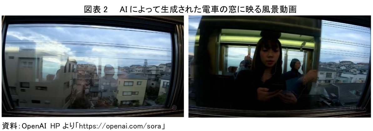 また、欠点がまったく見当たらない動画の事例として、電車の窓から見える風景動画を挙げる。AIに「東京郊外を走る電車の窓から見える風景」と指示したところ、指示通りの8秒の動画が生成された。この動画では、電車の窓ガラス越しに見える東京郊外の街並みが映し出された直後、建物の前を電車が通過する瞬間に、光が遮断され、電車の窓に人の映り込む様子までが再現されている(図表2)。