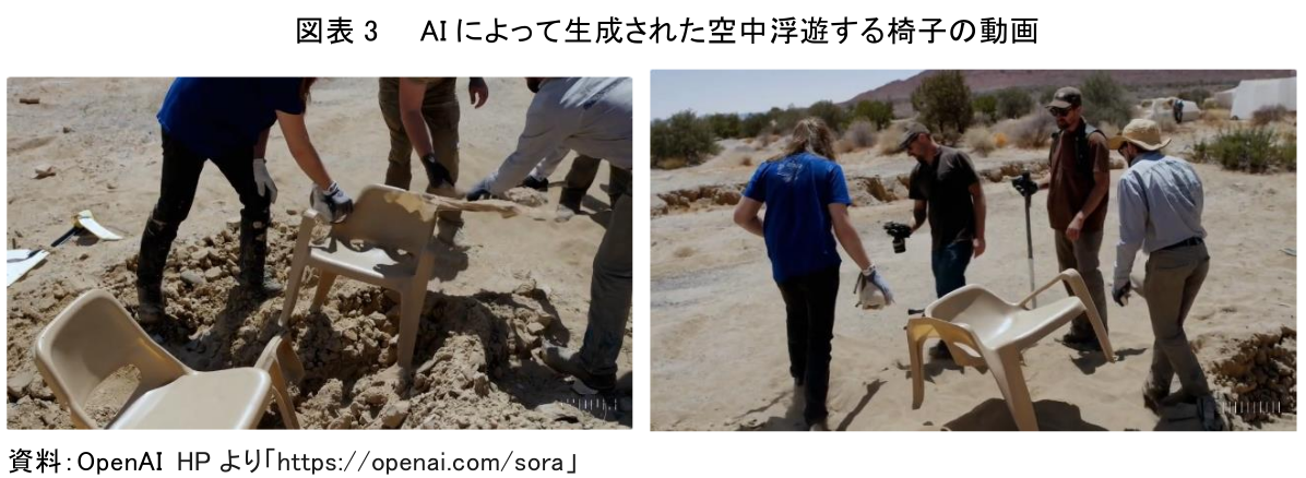 次に、現実世界では想定できない映像を含む動画の一例として、空中に浮遊する椅子の動画を挙げる。AIに「考古学者が砂漠で一般的なプラスチックの椅子を発見」と指示したところ、13秒の動画が生成された。指示に沿ったリアルな動画が再現されているかに見えるが、途中からリアル動画生成AIは椅子の重さを動画上で再現することに失敗し、現実世界ではあり得ない椅子が数秒間空中に浮遊する様子が映し出された(図表3)。
