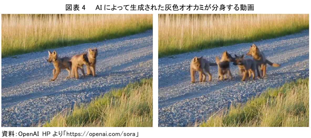 また、現実世界では想定できない映像を含む動画のいま1つの事例として、動画の最初に登場する3匹の狼が分身して5匹になる動画を挙げる。AIに「草に囲まれた人里離れた砂利道で、5頭のハイイロオオカミの子供がじゃれ合い、追いかけっこをしている」と指示したところ、10秒の動画が生成された。初めに映し出された3匹の狼が、4匹、5匹と分身してしまい、現実世界では考えられない映像が生成された(図表4)。