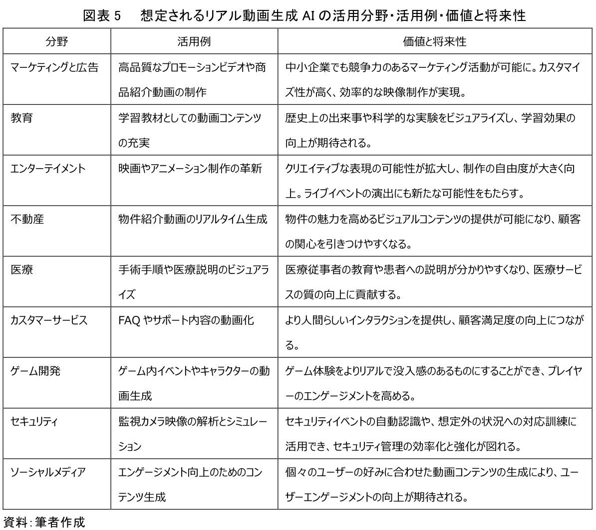 さらにエンターテイメント業界においては、リアル動画生成AIは映画やアニメーション制作に革命をもたらす可能性を秘めている。特に短編映画やミュージックビデオの制作において、AIを活用することで、従来は想像もつかなかったようなクリエイティブな表現が可能になり、制作の自由度が大きく広がることが予想される。さらに、リアルタイムで動画を生成する能力は、ライブイベントの演出に新たな可能性をもたらすかもしれない(図表5)。