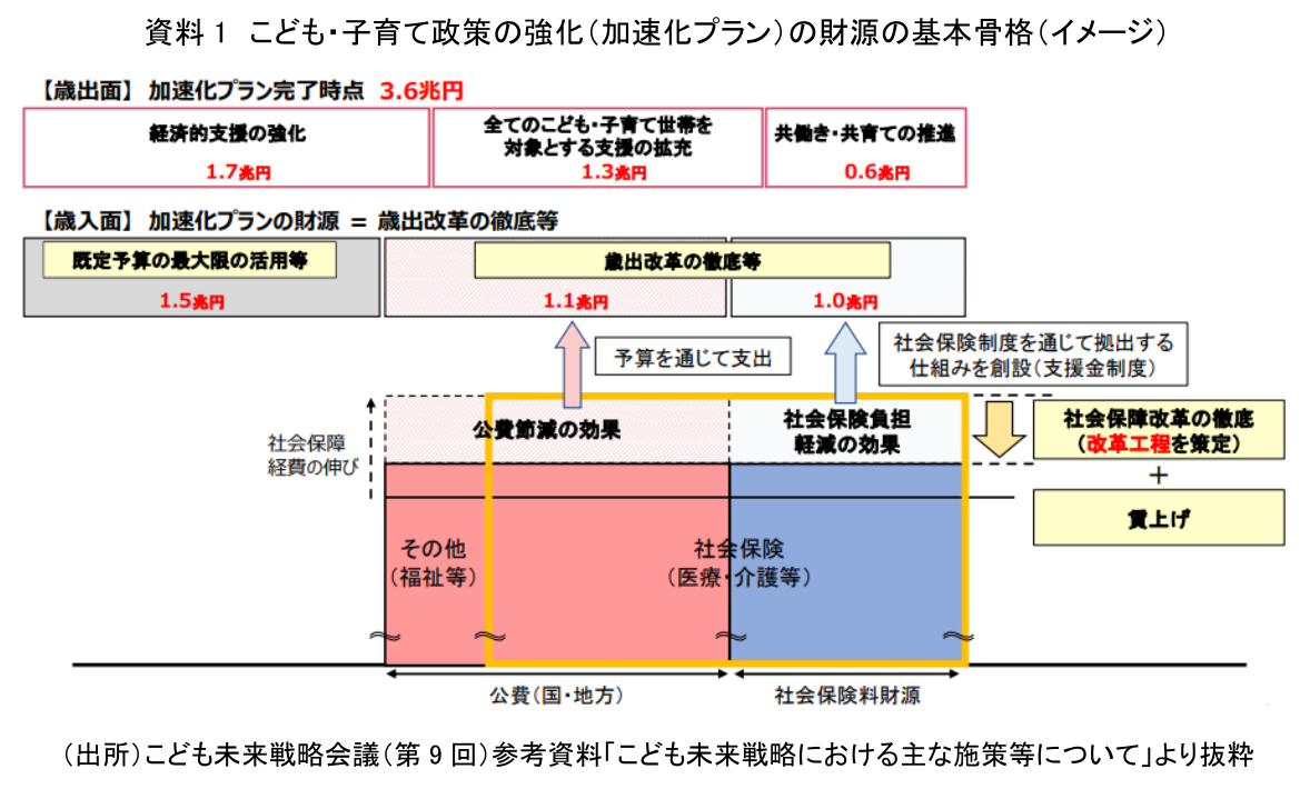 まず「こども未来戦略」の「加速化プラン」に要する財源の基本骨格について、改めて確認しておきたい(資料1)。