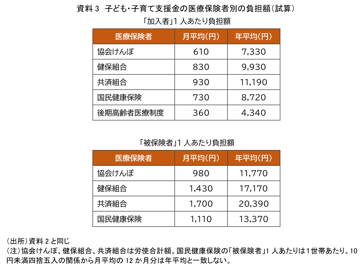 その結果が資料3であるが、主に現役世代が加入する被用者保険の場合、保険料は労使折半されるため、事業主負担分を除けば、負担額は約半分となる。従って、事業主負担分を除いた「加入者1人あたり」では、試算金額の半分(例えば、協会けんぽ月300円程度、健保組合月400円程度)と、岸田首相の説明通り概ね月500円弱となる。しかしながら、事業主負担を含めると、月500円を上回る結果となった。