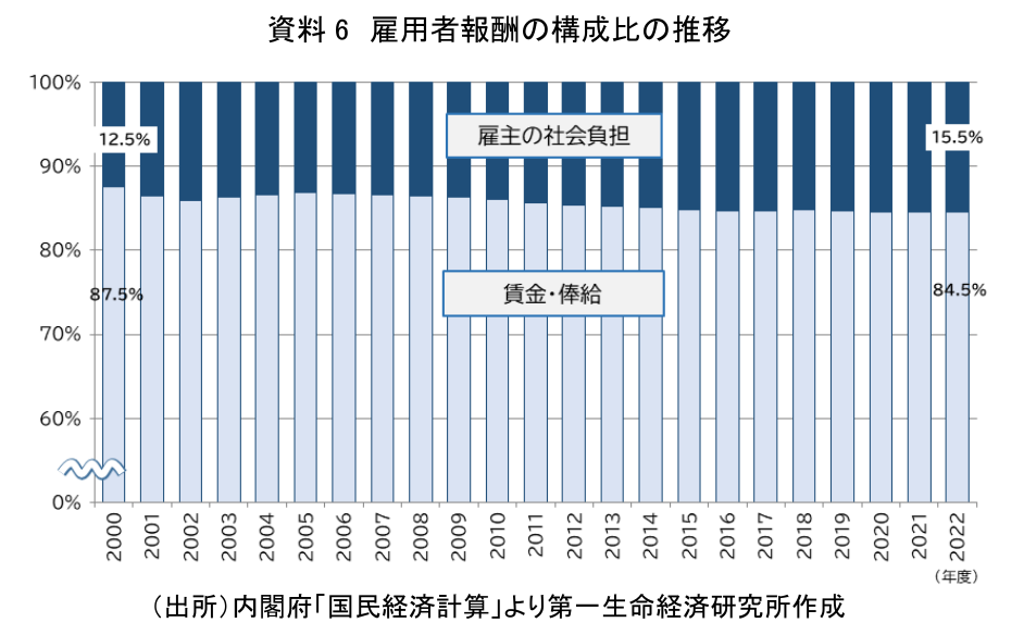 なお、単身者であっても、加入者1人あたりではなく、被保険者1人あたりの負担額となるし、共働き世帯の場合は、それぞれが医療保険の被保険者として負担する場合もある。被保険者の所得金額や加入している保険制度や組合によっても負担額は変わるため、実態に合った丁寧な説明が求められる。さらに、資料3の負担額は労使合計であるが、社会保険料(ここでは支援金)の事業主負担分は、雇用者報酬の一部と捉えることもできる(後述)。事業主の保険料負担が増加するため、従業員の賃上げへの配分を削らざるを得ないといった懸念も否めないだろう。