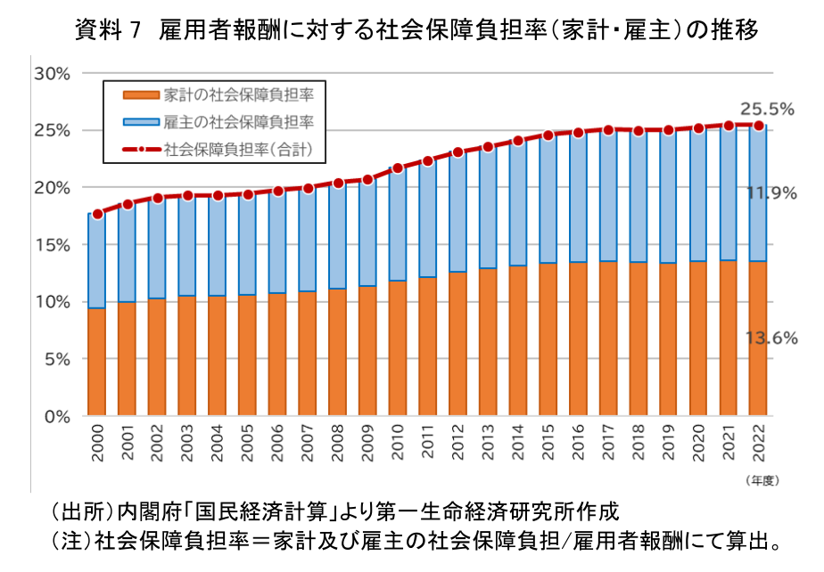 他方で、分子の社会保険負担については、国民経済計算では家計と雇主の社会保障負担の合計となる。支援金は事業主も負担するなか、社会保険料の事業主負担分は、雇用者報酬の一部と捉えることもできるため、実質的な負担が生じないとするなら負担の計算上、事業主負担の扱いについても明らかにすべきである。