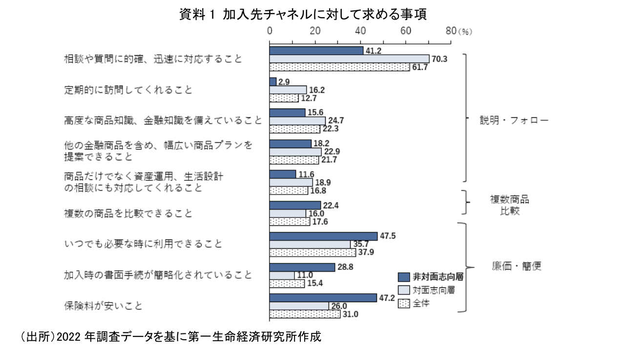 本号では、2022年調査で質問された顧客の意識に係る回答を基に、非対面志向層と対面志向層、全体とを比較し、非対面志向層の特徴を分析する。この顧客の意識としては、加入先チャネルに対して求めていること、加入先保険会社に対して求めていること、及び生保商品の性格についての意識である。