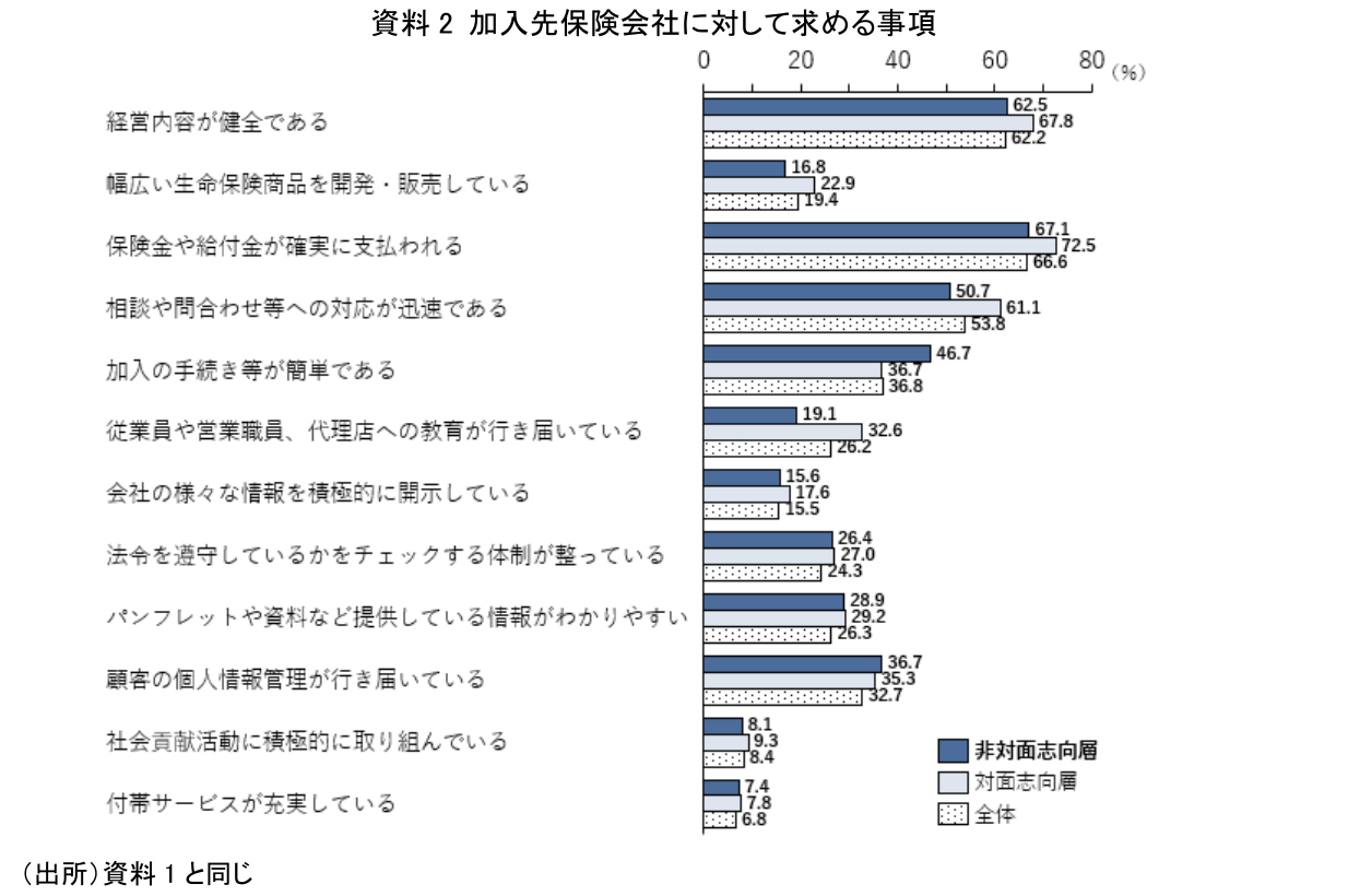資料1は非対面志向層の加入先チャネルに対して求めることを対面志向層、全体と比較して示したものである。