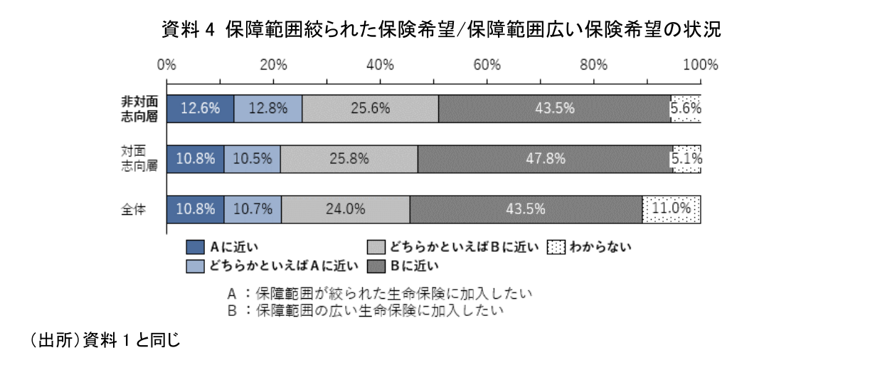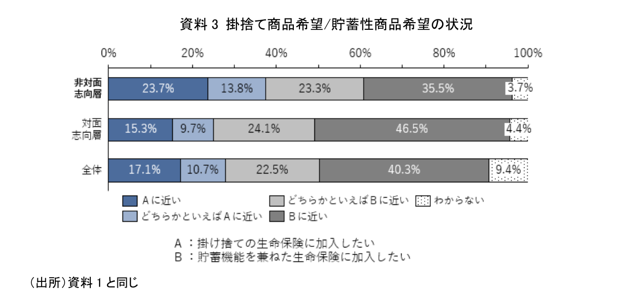 資料3は、掛捨て商品希望、或いは貯蓄性商品希望かを4段階で尋ねた質問への回答について、非対面志向層と対面志向層、全体とを比較したものである。