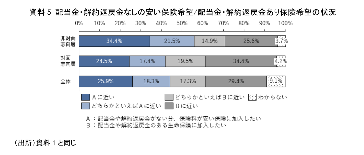 加入先チャネルへ求めることで確認したように、非対面志向層は対面志向層、全体と比べ廉価であることに対する希望が強かった。資料5をみても、配当金・解約返戻金はなくても安い保険を求める割合は、5割を大きく超えており、対面志向層、全体と比べて10%ポイント以上水準が高い。非対面志向層は保険料の安い商品への希望は強いといえる。将来非対面志向層が増大し、非対面での商品加入が増加した際には、現在以上に保険料の値下げへのニーズが強くなっていくことが想定される。
