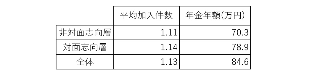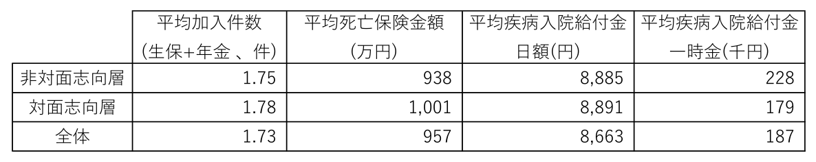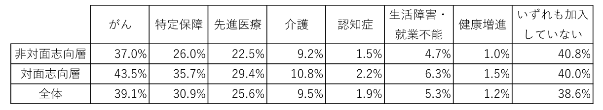 また、末尾に付録として非対面志向層の保険加入状況について対面志向層、全体と比べた表を付けておく。非対面志向層の加入実態を探る一助として頂ければと思う。