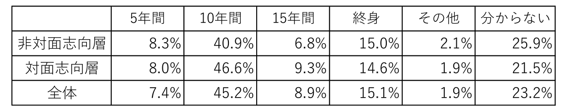 受取期間は5年の割合が高く、終身の割合も非対面志向層よりは若干高い。