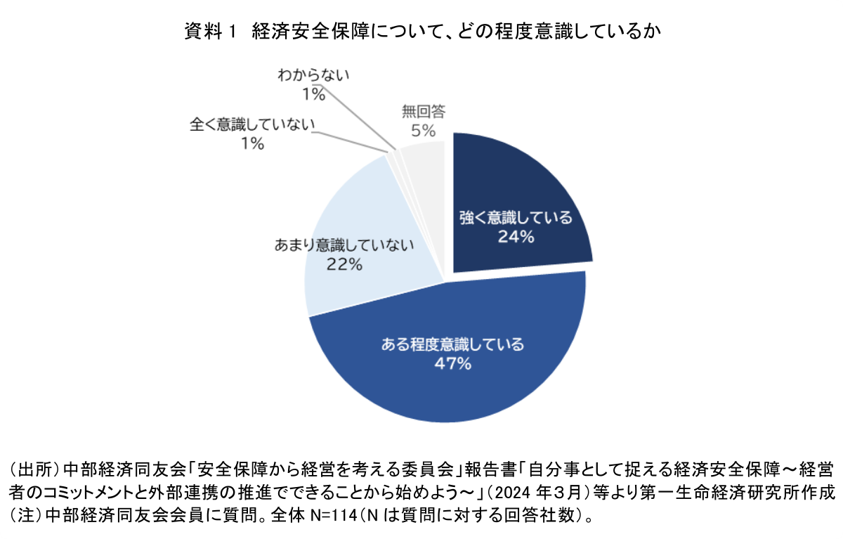 まず、企業が経済安全保障についてどのくらい意識しているのかについて確認した(資料1)。アンケート調査によると、経済安全保障について「強く意識している」とする回答が全体の24%、「ある程度意識している」とする回答が47%で、両者を加えた肯定的な回答は全体の約7割であった。