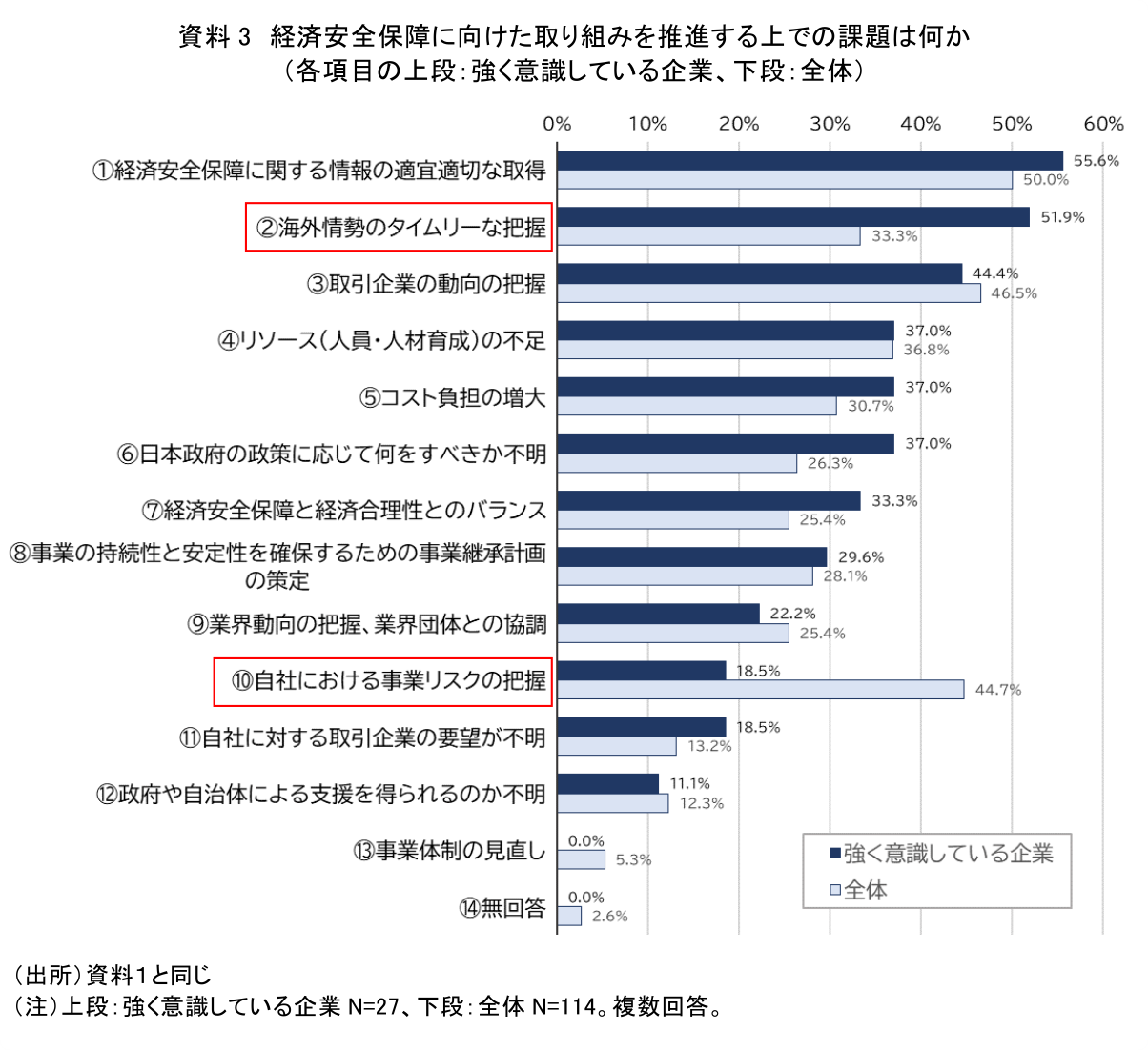 一方で、全体と大きく異なる点についてみてみたい。まず「②海外情勢のタイムリーな把握」である。「強く意識している」企業では上から2番目の課題にあがっているが、全体では5番目であった。(1)でも述べたように、「強く意識している」企業は比較的大企業が多いため、生産・販売等においてグローバル展開していることが一因ではないかと考えられる。