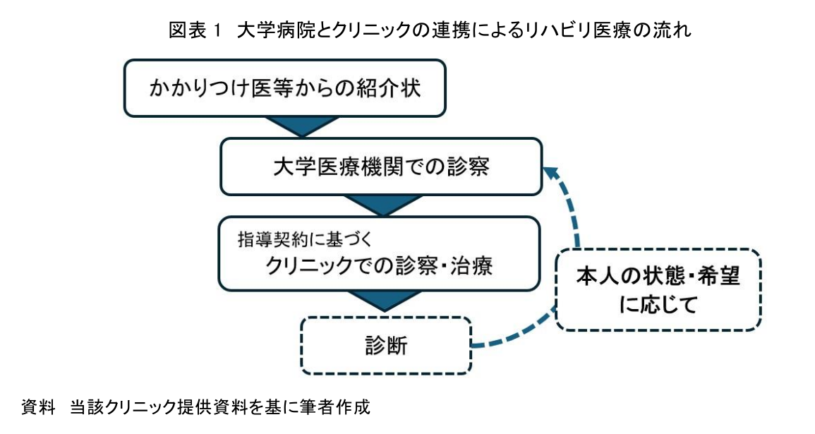 そこで、リハビリ医療へのアクセスを容易にすべく、大学病院とクリニックの連携による新たなモデルが試行され始めた。このモデルは、医師の診療と処方にもとづいて、先端技術を活用したリハビリ医療を慢性期の患者にも提供するものである。具体的には、大学病院のリハビリ医療の専門家(専門医や理学療法士等)とクリニックの専門家が協働して診断と治療を提供するもので、治療実施までの流れは図表1のとおりである。この連携は、従来の枠組みを超えた新しい医療提供モデルとなっている。