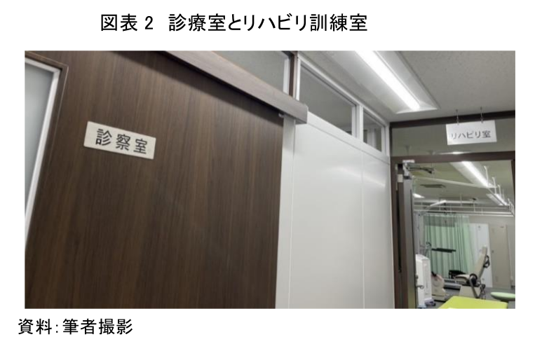 ここでは、大学病院とクリニックの連携による新たなリハビリ医療モデルにおける治療の具体例を紹介する。今回取材したクリニックには、診察室とリハビリ訓練室がある(図表2)。リハビリ訓練室には大型の装置ではなく、机上で使用可能なコンパクトな機器が多く装備されており、リハビリ医療の特徴でもあるマンツーマン形式で治療が実践されている。