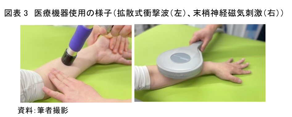 これらの機器は、機能回復に一定の効果をもたらしていることが確認されており、リハビリの組み合わせによっても身体機能の改善が見られる。機器・療法の中には、拡散式衝撃波や末梢神経磁気刺激の療法など、一般に馴染みがない機器や治療法もある(図表3)。
