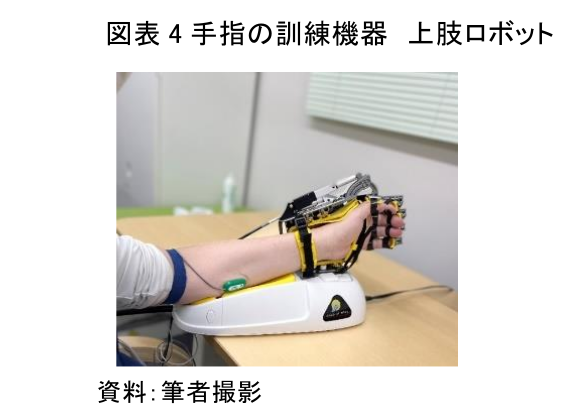 さらにこのクリニックには、上肢については手指の屈伸を促すロボット機器が、下肢については歩行を訓練する機器が備わっている(図表4)。