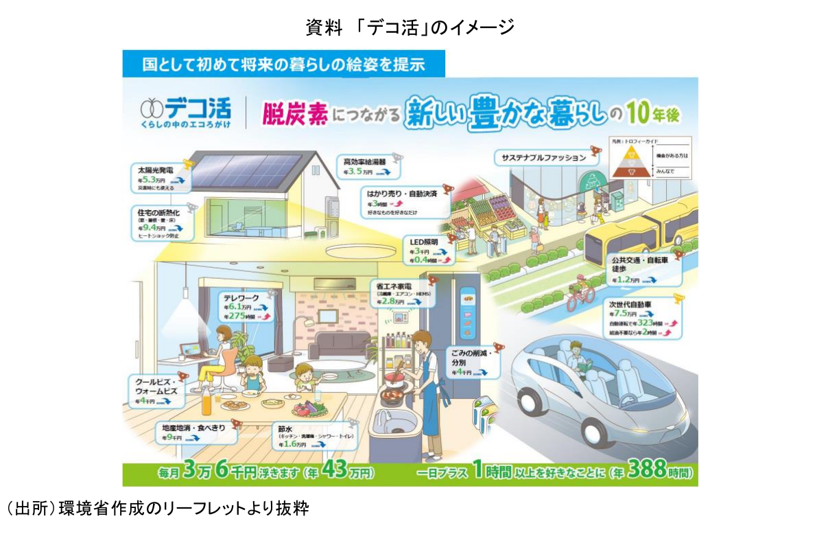 国として初めて将来の暮らしの絵姿を提示し、衣食住・職・移動・買物について、住宅の断熱化や太陽光発電の導入、LEDや省エネ家電等エコグッズの選択、クールビズ・ウォームビズ、適量購入やごみの削減・分別、テレワークの実践、電動車の購入や環境負荷の小さい移動手段の選択等を呼び掛けています(資料)。