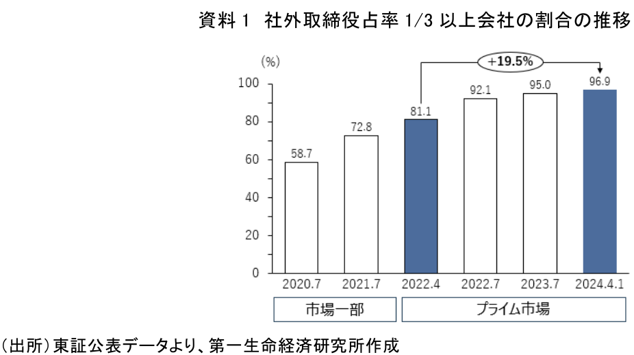 資料1は市場一部、プライム市場において社外取締役を取締役数の1/3以上選任している会社の割合の推移を示したものである。