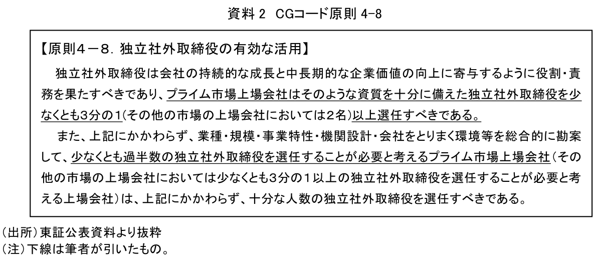 CGコードの原則4-8はプライム市場の創設に併せて資料2のとおりに改訂され、プライム市場上場会社は1/3以上の社外取締役を選任することが求められている。