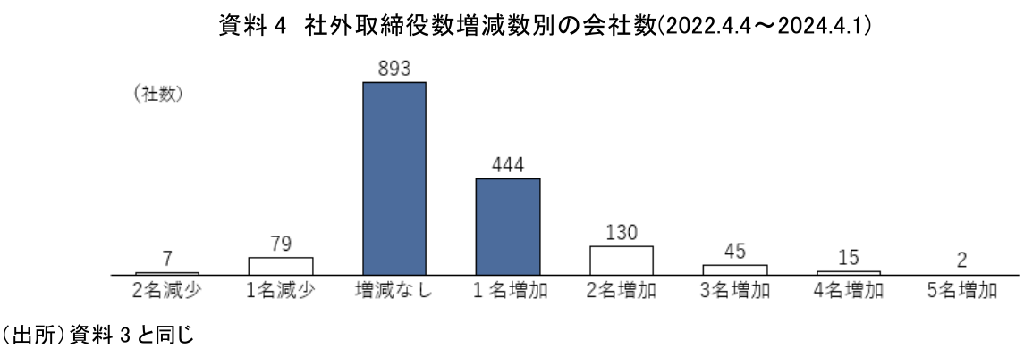 まず、この1615社の社外取締役の増加数はこの2年間で816名であった。この増加数について社外取締役数増減数別の会社数の状況を示したものが資料4である。