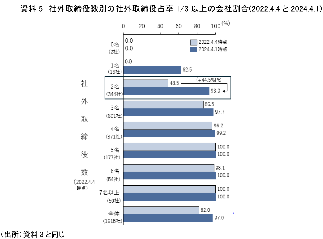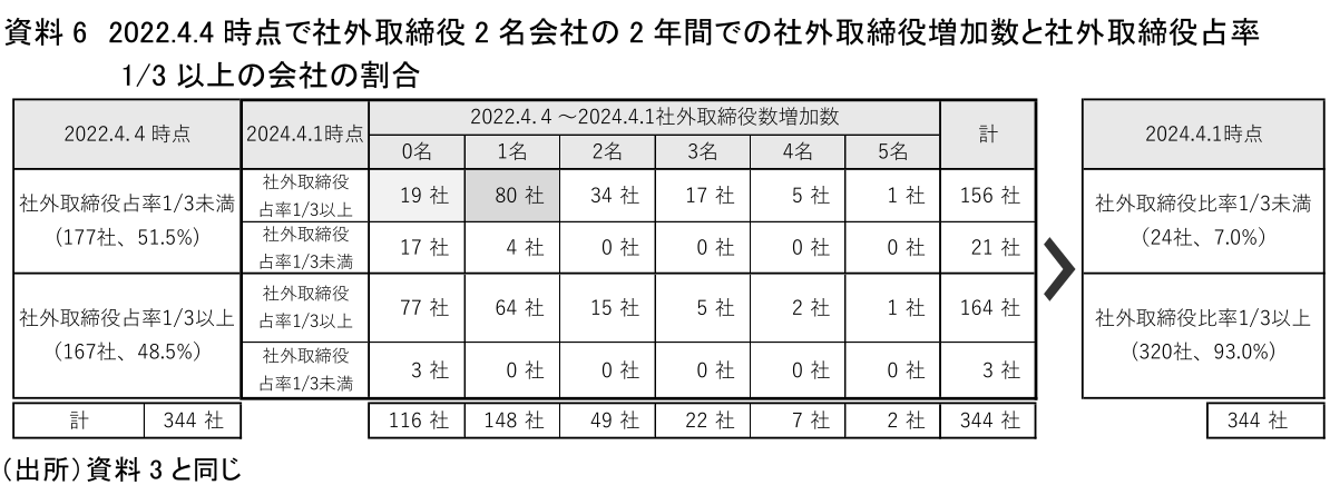 344社のうち、2022年4月4日時点で社外取締役占率が1/3未満であった会社は51.5%にあたる177社であったが、この2年間でこの資料の通り社外取締役数を増加させた結果、156社が社外取締役占率1/3以上の会社となった。逆に当初より1/3以上であった167社の内、3社が社外取締役占率1/3未満となり、結果として320社が社外取締役占率1/3以上の会社となっている。