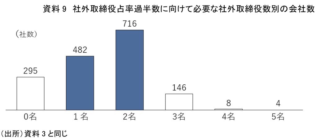 しかし、現状の取締役数を前提としてプライム市場上場全会社の社外取締役占率過半数に向けて必要な社外取締役数別の社数分布は資料9の通りであり、個社単位でいえば1~2名の増加で足りる会社が7割を占める。しかも、第3章で触れたように社外取締役占率を上げるためには、社内取締役数を減らすという方策もある。簡単な仮の試算であるが、現在社外取締役占率が過半数となっていない会社が社内取締役数を1名減らすとすれば、社外取締役数を1名増加させるだけで、プライム市場上場会社の7割程度の会社が、社外取締役占率過半数の会社となる。前述の通り、社外取締役の質の維持・向上といった課題はあるが、社外取締役占率が過半数となっている会社がプライム市場で太宗を占めるのは、意外に近いことなのかもしれない。
