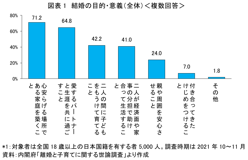 内閣府が2021年に行った調査から結婚の目的・意義に関する人々の考え方をみると、回答者全体で最も多く挙げられたのは「心安らげる場所である家庭を築くこと」(71.2%)で、「愛するパートナーと生涯を共に過ごすこと」(64.8%)がこれに続いた(図表1)。「二人の間に子どもをもうけて育てること」(42.2%)、「二人が経済面や家事の分担で助け合って生活すること」(41.0%)、「親や周囲を安心させること」(24.0%)、「付き合ってきたけじめをつけること」(7.0%)なども挙げられているが、上位2項目に比べるとかなり低い。家族の形や、家計・家事に関する多様な実