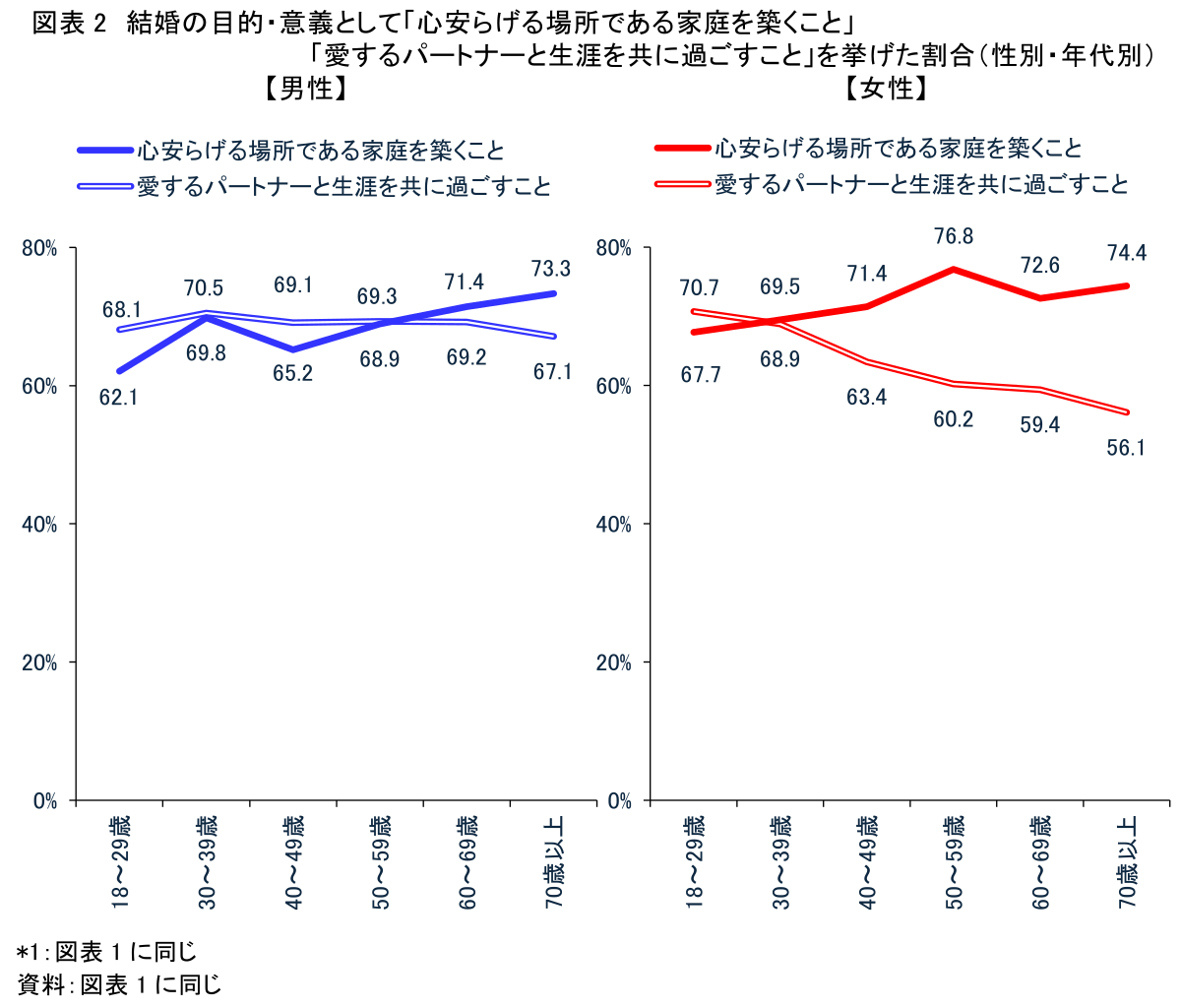 心安らげる家庭を築くことや、パートナーと生涯を共に過ごすことを挙げる傾向はどの世代にも共通すると思われるかもしれない。しかしながら、男性では年齢を重ねても両者にそれほど大きな差がみられないのに対し、女性は年齢とともに後者が低くなる傾向にある(図表2)。