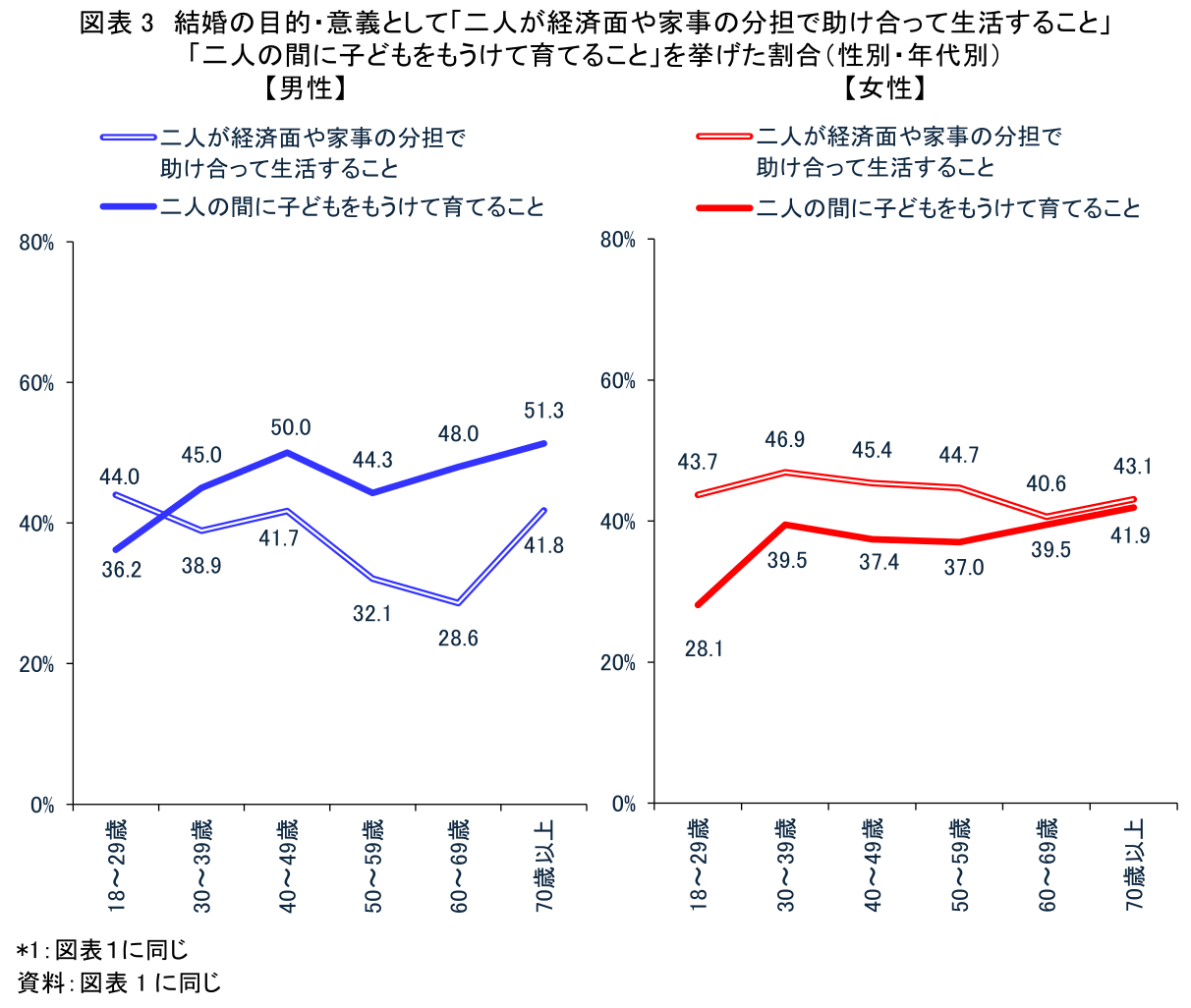また、前出の図表3によると、40代以下で「二人が経済面や家事の分担で助け合って生活すること」を挙げる割合の男女差は50~60代に比べ小さく、男性も女性に近い割合となっている。若い世代は女性の就労継続を想定したライフデザインを描いているため、男性の収入を中心に生活設計を行ってきた上の世代に比べると、この点を目的・意義と考える人が多いようだ。