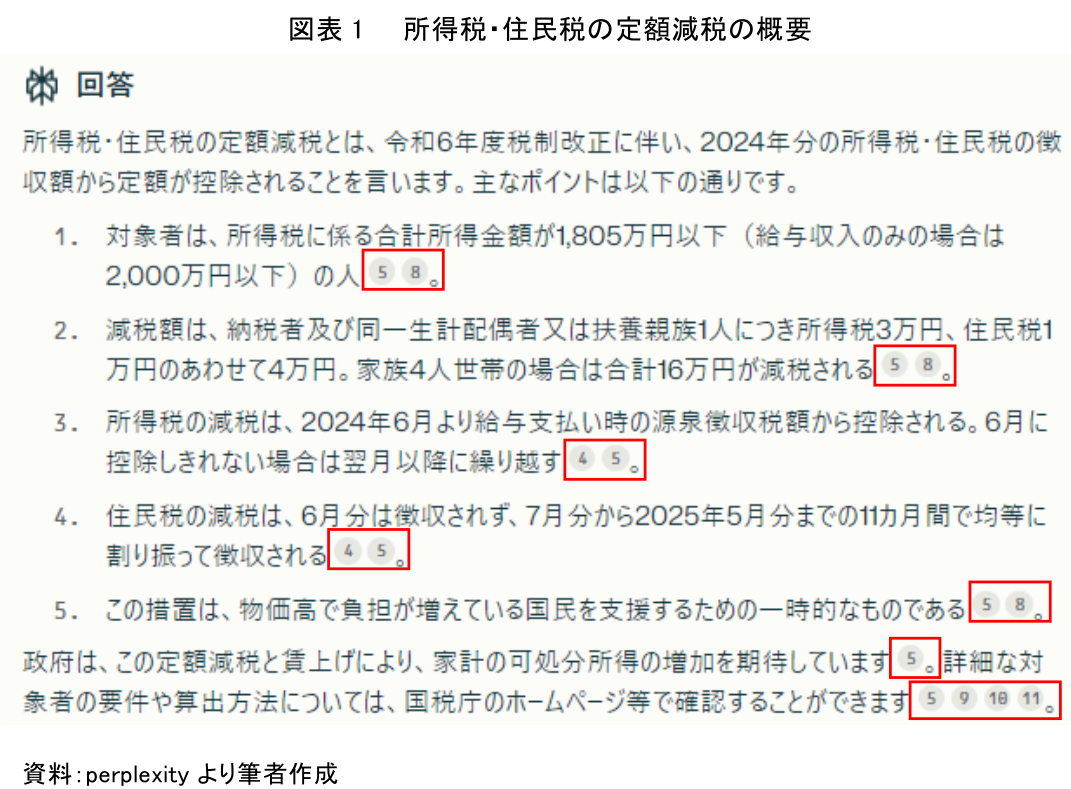 まず、概要検索について、AIに「所得税・住民税の定額減税とは?」と入力した。その結果、AIは「所得税・住民税の定額減税とは、令和6年度税制改正に伴い、2024年分の所得税・住民税の徴収額から定額が控除されることを言います」という概要を記載のうえ、図表1のように対象者の要件や算出方法について詳細な説明結果を作成した。作成された結果の引用元も明示されるため、信頼のおける情報ソースなのかもシームレスに確認できる(図表1赤枠)。