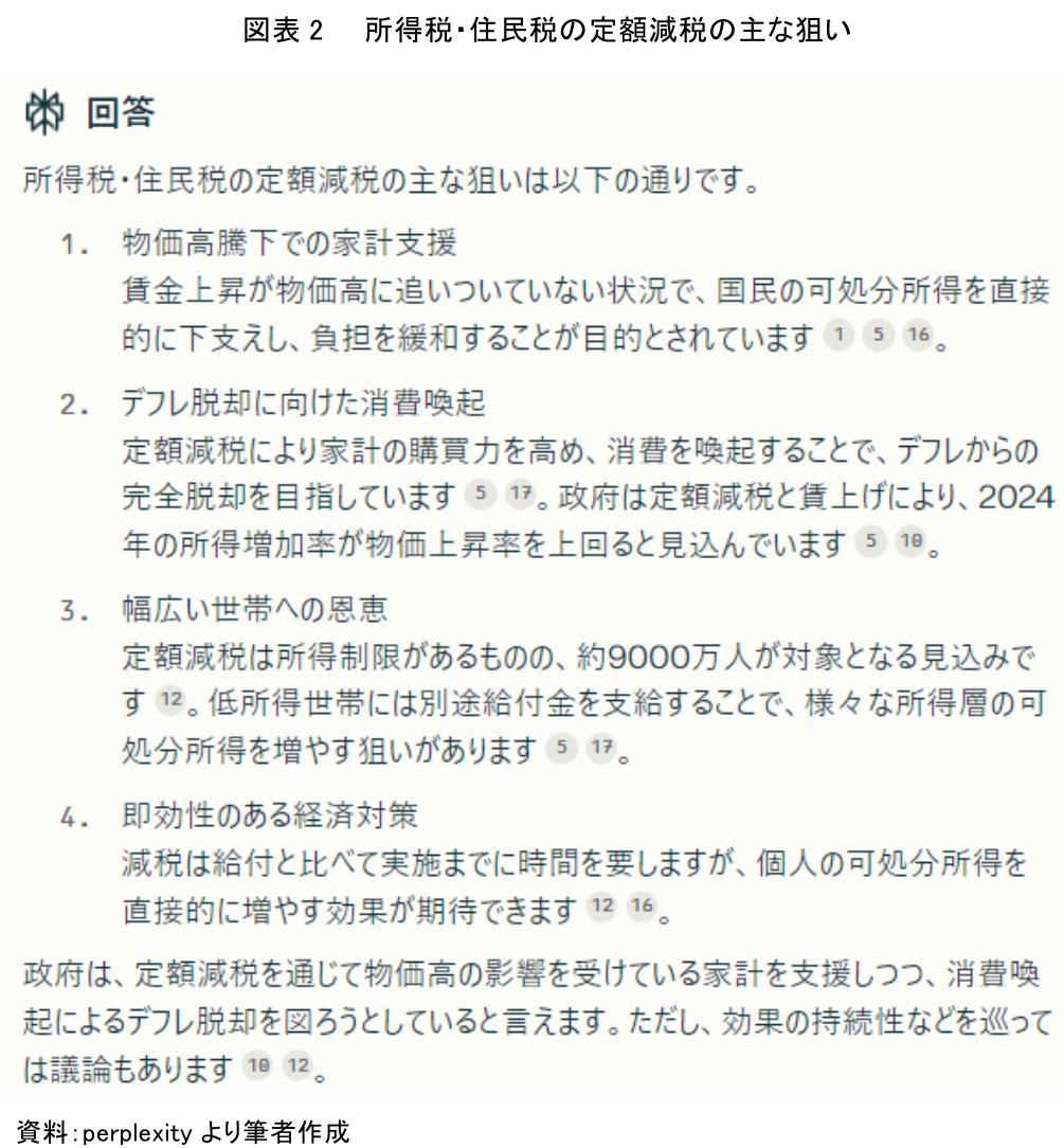 次に、深堀検索について確認してみよう。概要検索で出力された結果の中で、さらに深堀りしたい内容があれば、それをAIに質問すればよい。ここではAIに「所得税・住民税の定額減税の狙いは?」と入力した。その結果、AIは「所得税・住民税の定額減税の主な狙いは以下の通りです」と回答したうえで、物価高騰下での家計支援、デフレ脱却に向けた消費喚起、幅広い世帯への恩恵、即効性のある経済対策という4つの項目を回答した(図表2)。