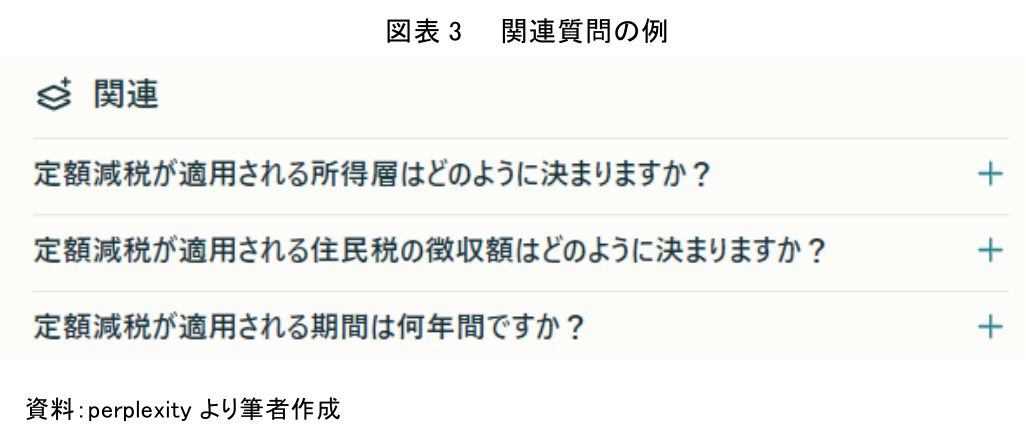 さらに、関連検索では、AIが回答した内容の最後尾に、「所得税・住民税の定額減税の狙いは?」に関連する質問が自動で表示された(図表3)。ユーザーがさらに関連した検索を行いたい場合、AIが推薦した関連質問の中から興味のある質問を選択すればよい。ここでは、提示された3つの質問の中にある「定額減税が適用される所得層はどのように決まりますか?」について回答を求めてみた。
