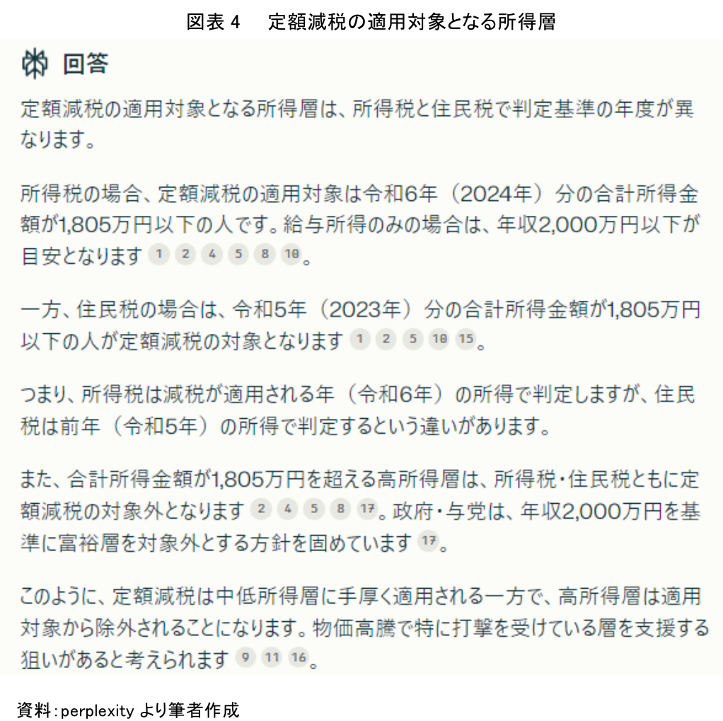 その結果、AIは「定額減税の適用対象となる所得層は、所得税と住民税で判定基準の年度が異なります」と回答したうえで、定額減税の適用対象となる所得層についての詳細な情報をわかりやすく提示した(図表4)。