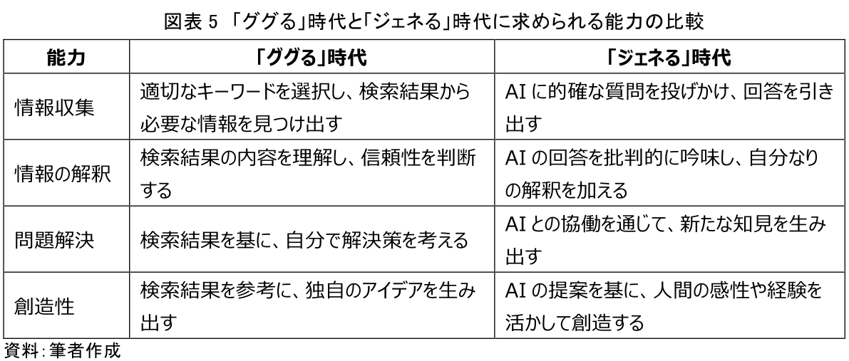 「ジェネるAI」の登場により、私たちは「ググる」時代から「ジェネる」時代へと移行しつつある。この変化は、単なる検索方法の変化にとどまらず、私たちの情報収集や問題解決のあり方そのものを大きく変えていくだろう。「ジェネるAI」を効果的に活用するには、従来の検索エンジンとは異なる新たなスキルが求められる。図表5は、「ググる」時代と「ジェネる」時代に求められる能力の違いを示したものである。