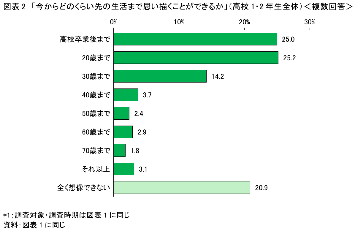 また、この調査では、既述した職業や家族形成の意向などに加え、将来の生活設計に関し、今からどのくらい先の生活まで思い描くことができるかについてもたずねている。その結果によると、20歳より先の将来を思い描いていると答えた生徒は全体の3割程度にとどまり、「全く想像できない」とした生徒も2割程度を占める(図表2)。半数超の生徒は「高校卒業後まで」を含め「20歳まで」と答えており、この時点で長い生涯の生活設計を具体的に思い描くのは、難しいことを示唆する結果となっている。