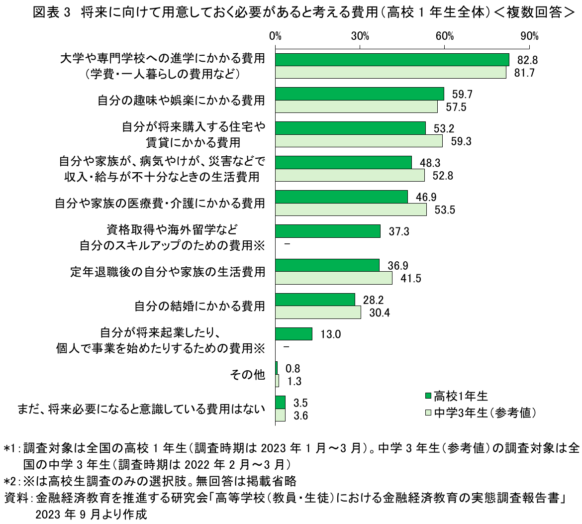 また、高校生では「資格取得や海外留学など自分のスキルアップのための費用」「自分が将来起業したり、個人で事業を始めたりするための費用」など、進学や職業選択にかかわる費用を挙げた生徒も各々4割弱、1割超を占める。卒業後の進路や20歳以降のキャリアデザインを具体的に考えている高校生では、これらのテーマへの関心も高いようだ。