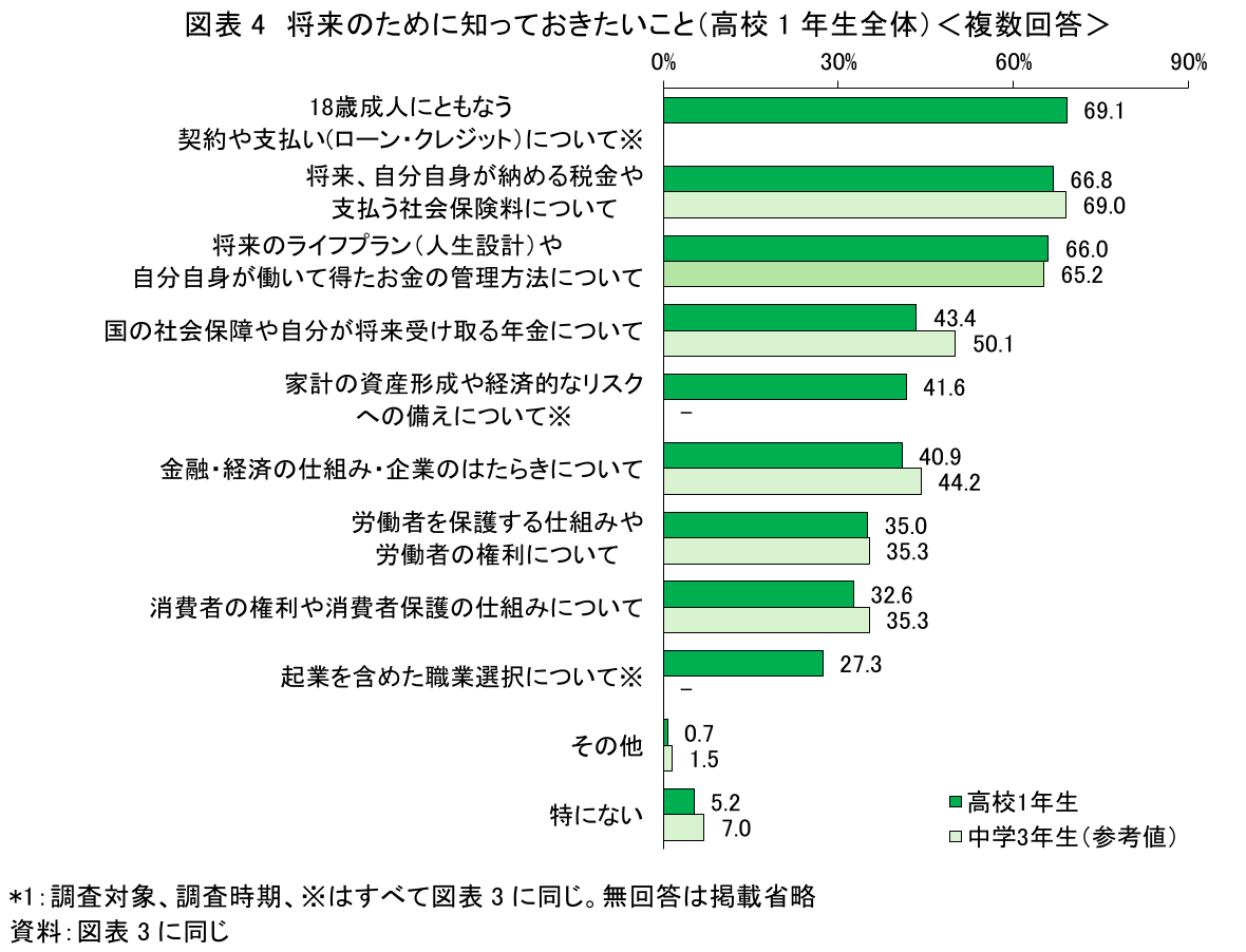 さらに、同調査では「将来に向けて知っておきたいこと」についてもたずねている。結果をみると、最も多く挙げられたのは「18歳成人にともなう契約や支払い(ローン・クレジット)について」であり、「将来のライフプラン(人生設計)や自分自身が働いて得たお金の管理方法について」も僅差で上位に挙げられている(図表4)。また、高校生では「家計の資産形成や経済的なリスクへの備えについて」を挙げた生徒も4割超を占める。先にみたように、20歳より先の未来を具体的に思い描いている生徒が少ないなかで、自身の進学や資格・技術の習得、現在・将来の生活にかかわる様々な費用を計画的に用意していくことに加え、そのための多様な手段に関する知識・情報に関心をもつ生徒が多くなっている。