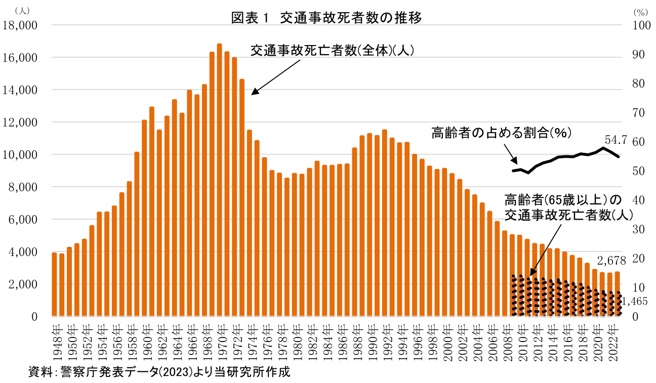 交通事故による死者は、長期的に減少傾向にある。1970年に16,765人に及んだが、交通安全対策基本法が制定されたことで10年間で半減した。その後も車両の安全性向上、シートベルトやチャイルドシートなどの義務化に加え、利用者に対する安全意識の啓蒙など様々なアプローチが奏功し、死者数は減少してきた。高齢者の交通事故死亡者数も近年減少傾向にあるが、高齢化の影響もあって交通事故死者数全体における高齢者の占める割合は54.7%と高く、「高齢者の事故」が目立つ一因となっている(図表1)。