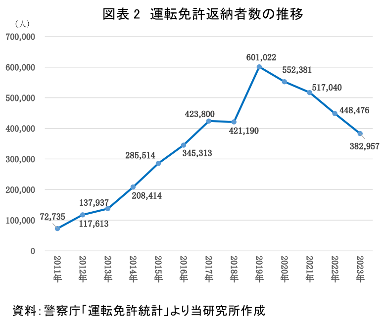 運転免許返納者数の推移をみると、ここ4年は減少傾向にあることがわかる(図表2)。2019年に大きく増加したのは、この年の4月に発生した「池袋自動車暴走事故」という高齢ドライバーによる痛ましい出来事が影響したと考えられる。