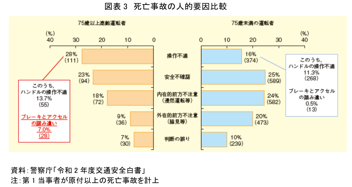 そもそも、高齢者の事故にはどのような特徴があるのだろうか。75歳以上の高齢運転者と75歳未満の運転者の死亡事故の人的要因を比較すると、両者には違いがみられる(図表3)。75歳未満の運転者では「安全不確認」「内在的前方不注意」といったものが多いのに対し、75歳以上の高齢運転者では「操作不適」が最多となっている。さらに操作不適としてカウントされる「ブレーキとアクセルの踏み間違い」については75歳未満の運転者で0.5%であるのに対し、75歳以上の高齢運転者では7.0%と顕著に高い。このように、高齢になると不注意というよりは「間違える」という要因での事故が多くなるといえる。