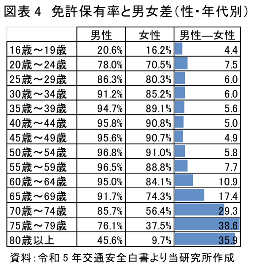 なお、現在100歳以上の人口は10万人近くに及ぶが、その約9割は女性であり、今後100歳以上の人口が爆発的に増加するなかで、高齢になればなるほど女性が多くなる傾向が続く。図表4のとおり、現在の60代以下では男女の免許保有率の差は小さく、近い将来、運転継続か免許返納かを悩む「母親」「祖母」が社会課題になることは想像に難くない。