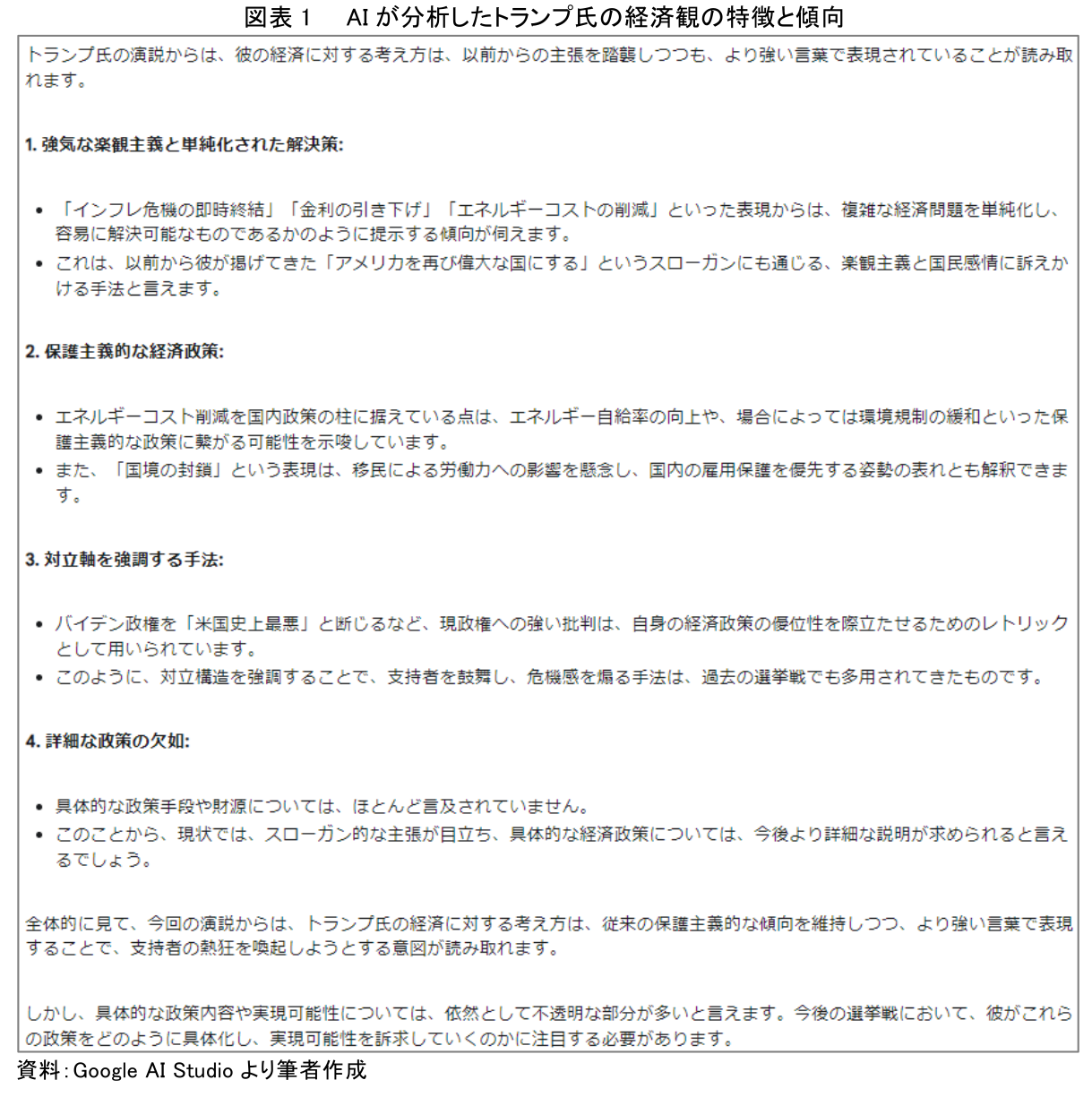 第一の工程では、トランプ前大統領の2024年7月18日の共和党全国大会での大統領候補指名受諾演説をAIに読み込ませ、経済に対する考え方を分析させた。それによると、トランプ氏の経済観は「強気な楽観主義と単純化された解決策」「保護主義的な経済政策」「対立軸を強調する手法」「詳細な政策の欠如」という特徴をもつことが明らかになった。AIはこれらの特徴から、トランプ氏の経済観が従来の保護主義的な傾向を維持しつつ、より強い言葉で表現することで支持者の熱狂を喚起しようとする意図をもつものと分析している(図表1)。