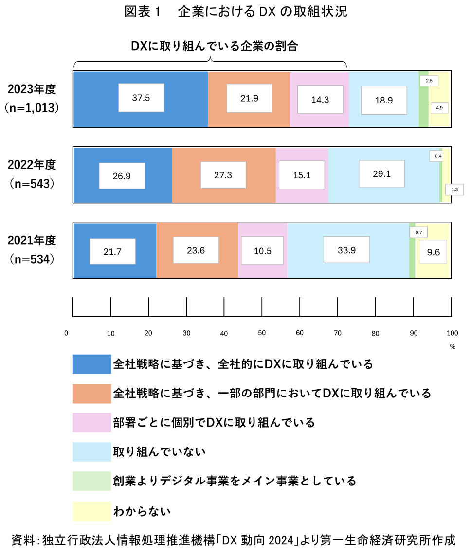 企業がDXを推進する流れは、2020年以降のコロナ禍の影響で加速した。感染拡大防止のため、各企業において日常業務やサービスの形態を「新しい生活様式」に対応するとともに、テレワークを導入する必要性が急速に高まった。それにより、DXの遅れが企業でも認識され、従来の押印や対面による業務方法をデジタル技術の活用により見直す必要性が指摘された。独立行政法人情報処理推進機構の調査によると、2023年度にDXに取り組んでいる企業の割合は2021年度の55.8%から73.7%に増加しており、着実にDXが企業に浸透していると指摘されている(図表1)。