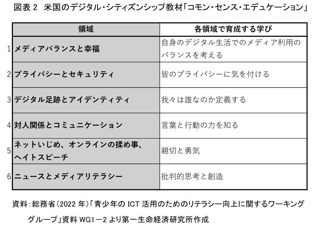 たとえば、米国で利用されているデジタル・シティズンシップの教材として「コモン・センス・エデュケーション」がある。この教材はハーバード大学大学院の研究機関が中心となって開発したもので、幼稚園児から高校生までを対象として6領域のデジタル・シティズンシップを学べるようになっている(図表2)。この中では、「プライバシーとセキュリティ」など情報モラル教育に関わる内容も扱われている。デジタル・シティズンシップでは、ソーシャルメディア(SNS)などを通じて情報を主体的に発信していくなかで必要に応じて情報モラルも学んでいく、ということである。この教材については、2020年に米国の6万人以上の学校に勤務する60万人以上の教育者が利用したとの報告がある(注11)。